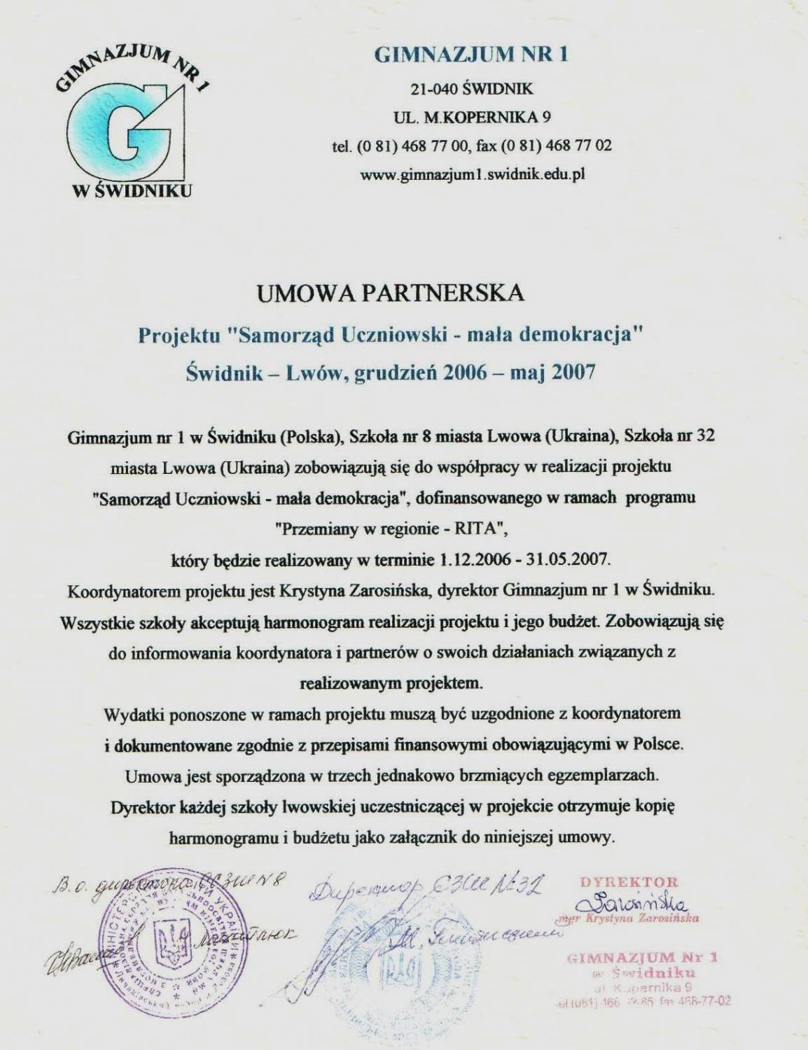 Договір про співпрацю гімназією №1 м.Свідніка (Республіка Польща)