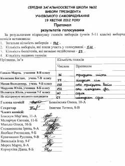 19 квітня 2012 року, у школі обрано нового президента учнівського самоврядування. У голосуванні взяли участь 516 учнв 5-11-х класів. Перемогу  виборола Маруняк Юлію, учениця 8-Б класу, набравши  152 голоси виборців.
