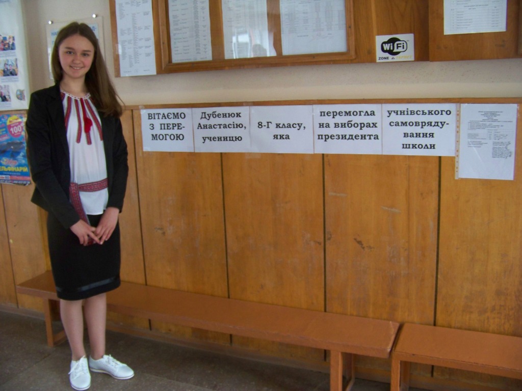 З кількістю 252 голоси перемогу здобула Дубенюк Анастасія, учениця 8-Г класу, яка випередила двох кандидатів-суперниць: Милимук Ірину, ученицю 9-В класу, Ємельянову Валерію, ученицю 8-В класу.