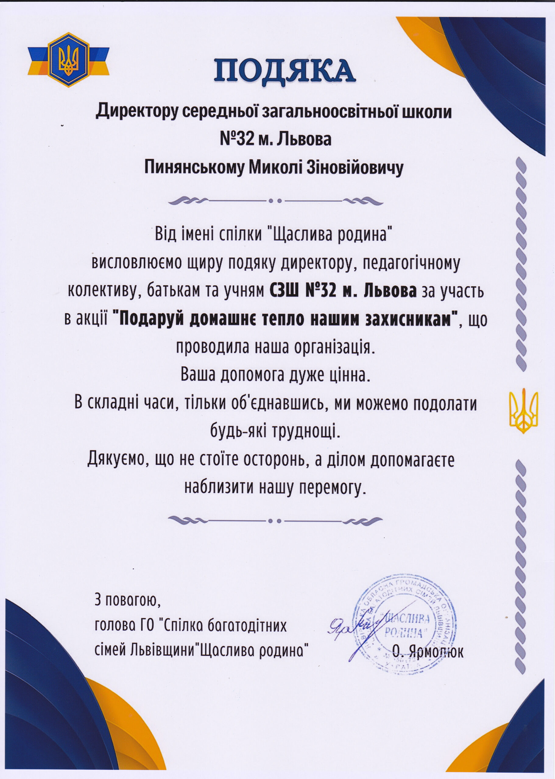 Впродовж лютого 2023 року у СЗШ №32 спільно з громадською організацією Спілка багатодітних сімей Львівщини “Щаслива родина” проведено благодійну акцію для Збройних Сил України “Зігрій воїна”.