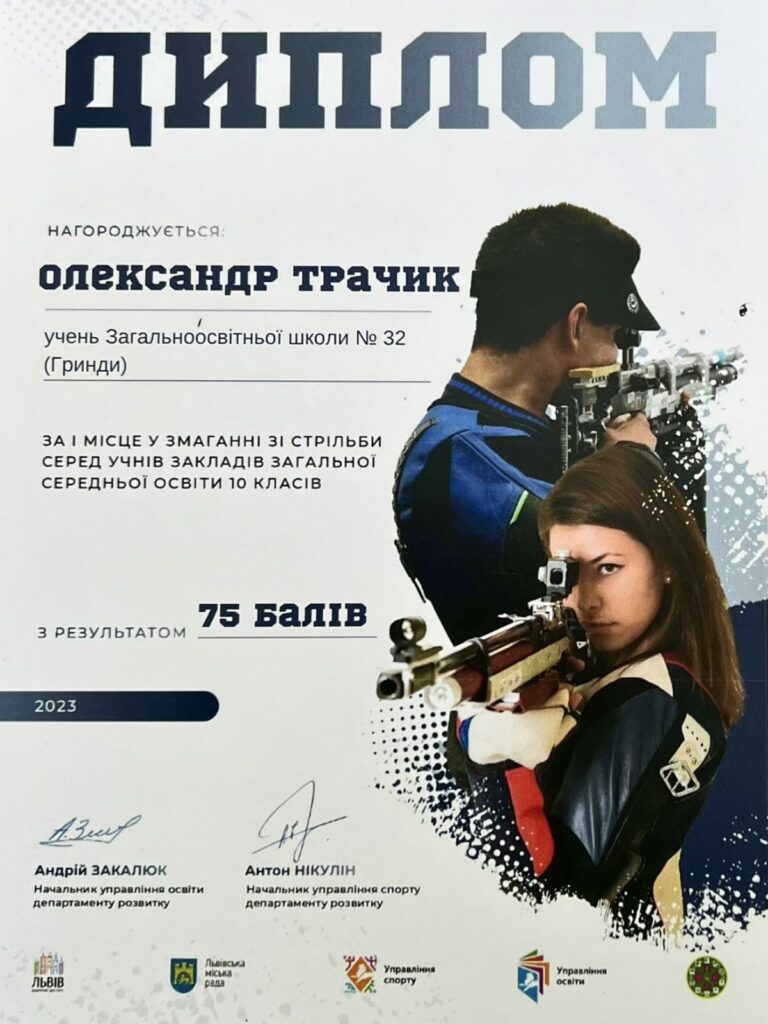 Трачик Олександр, учень 10-А класу, виборов І місце на змаганнях зі стрільби серед учнів 10 класів закладів загальної середньої освіти Львівської МТГ.