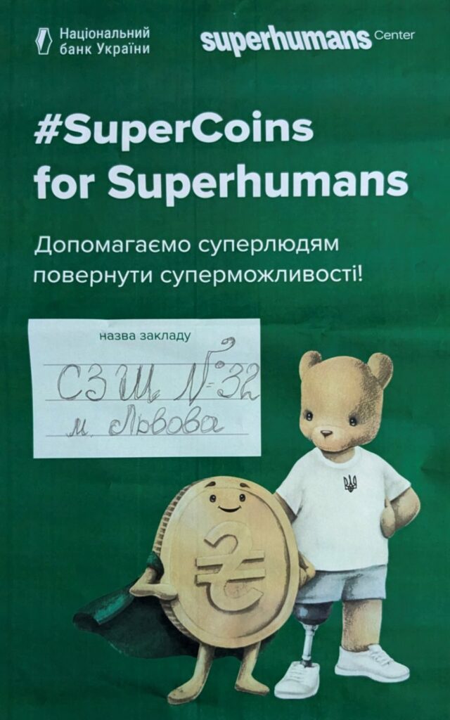 З 09 вересня до 23 жовтня 2024 року учні СЗШ №32 долучилися до благодійної акції #SuperCoins, організованої Національним банком України спільно з сучасною клінікою з протезування, реконструктивної хірургії, реабілітації та психологічної підтримки постраждалих від війни Superhumans Center.