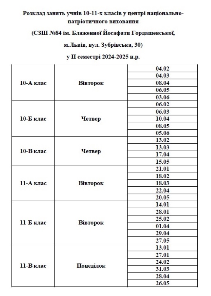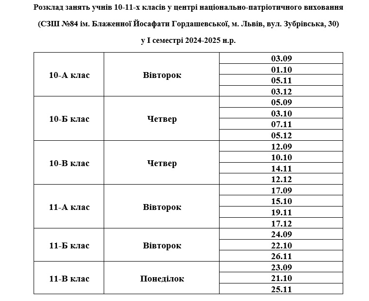 Розклад занять учнів 10-11-х класів у ЦНПВ